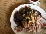 Pertama kali datang, kita langsung disuguh kacang mete, lalu pesan makan dan minum dalam teh poci. Menu yang diberikan adalah nasi merah (yang menjadi ciri khas), ayam goreng dan daging sapi goreng manis/bacem, brodhot (usus sapi) goreng manis/bacem, daun pepaya, ikan wader, dan trancam (bukan terancam). Dan tidak lupa lauk utamanya, yaitu sambal lombok (cabe).